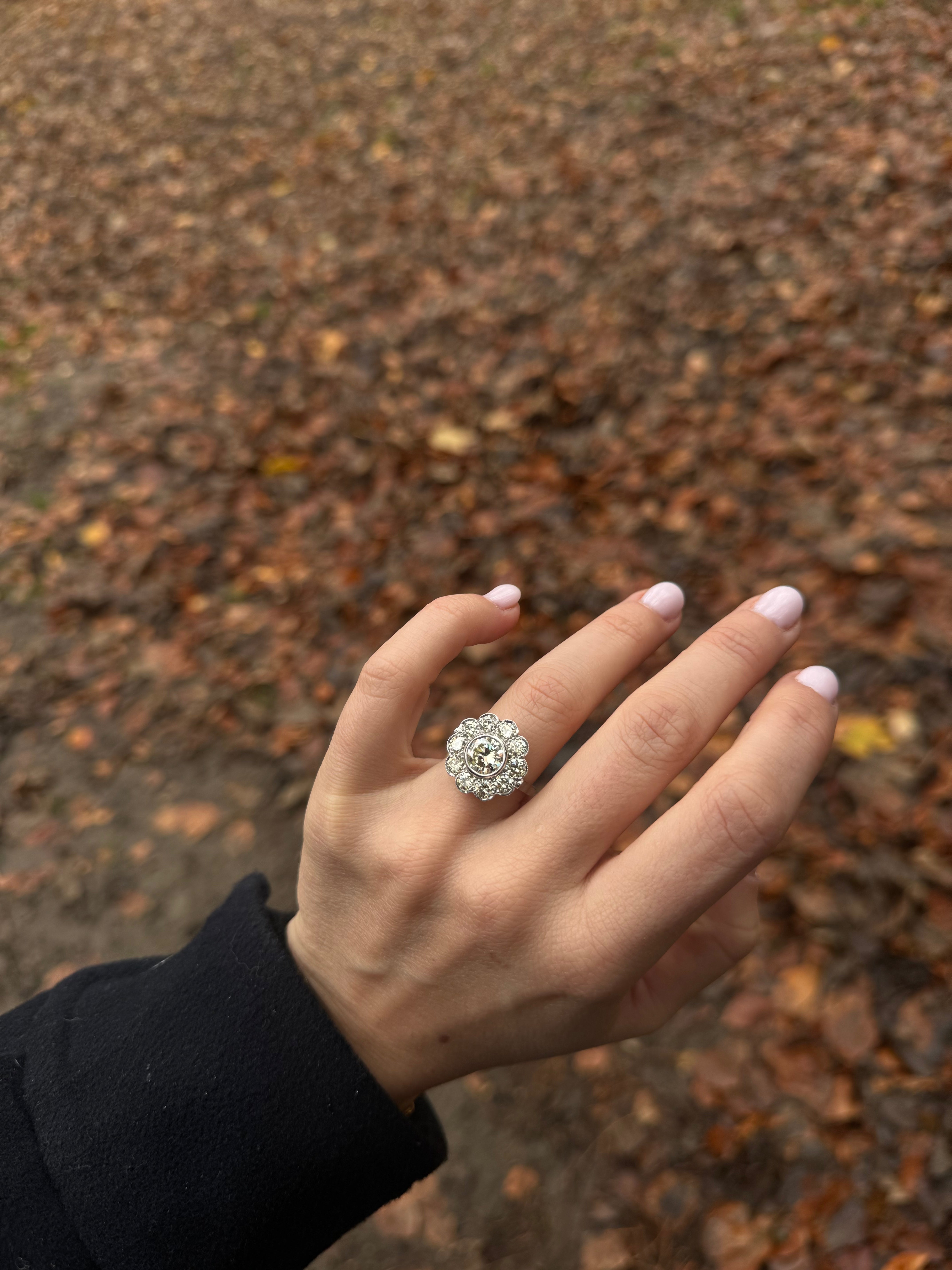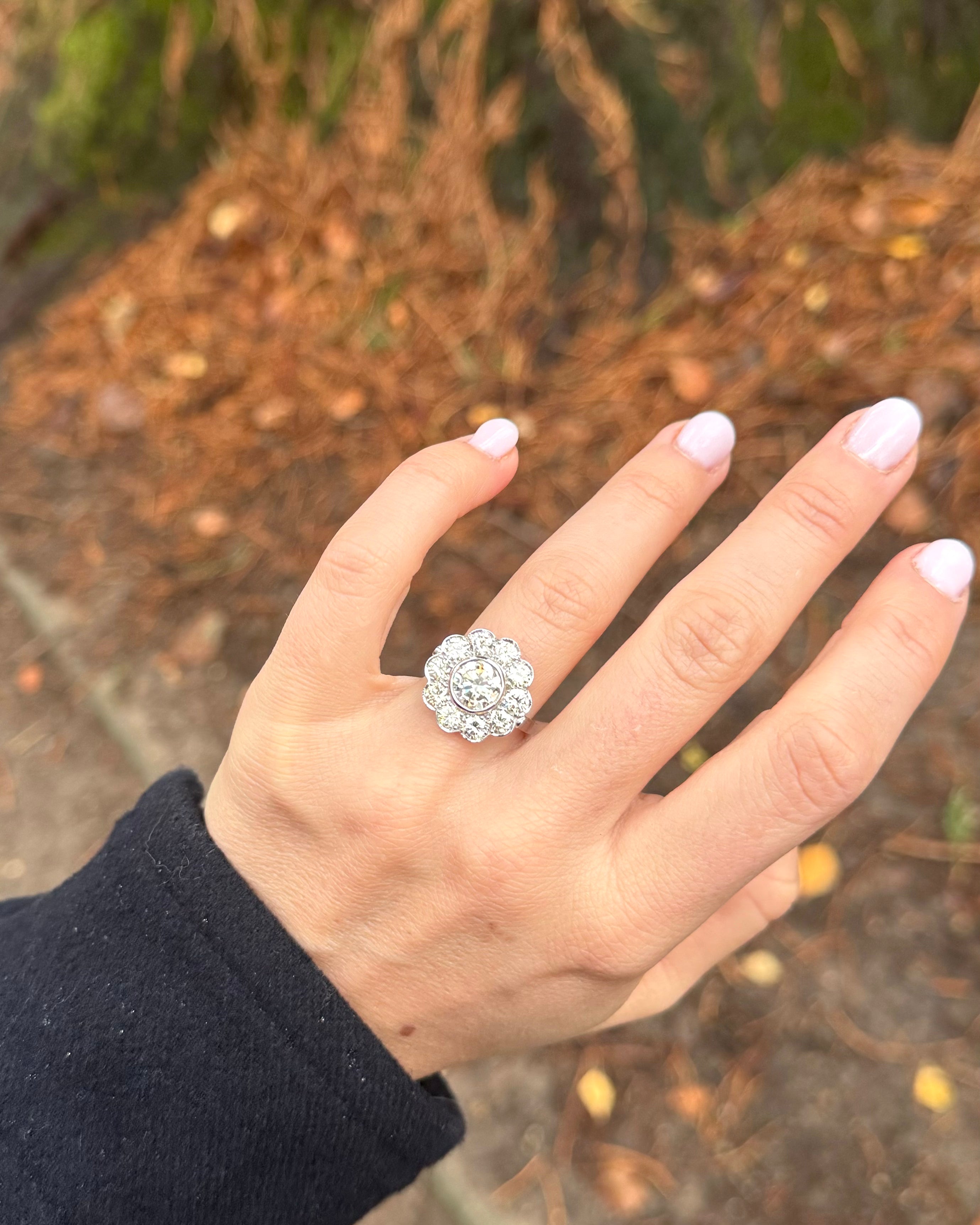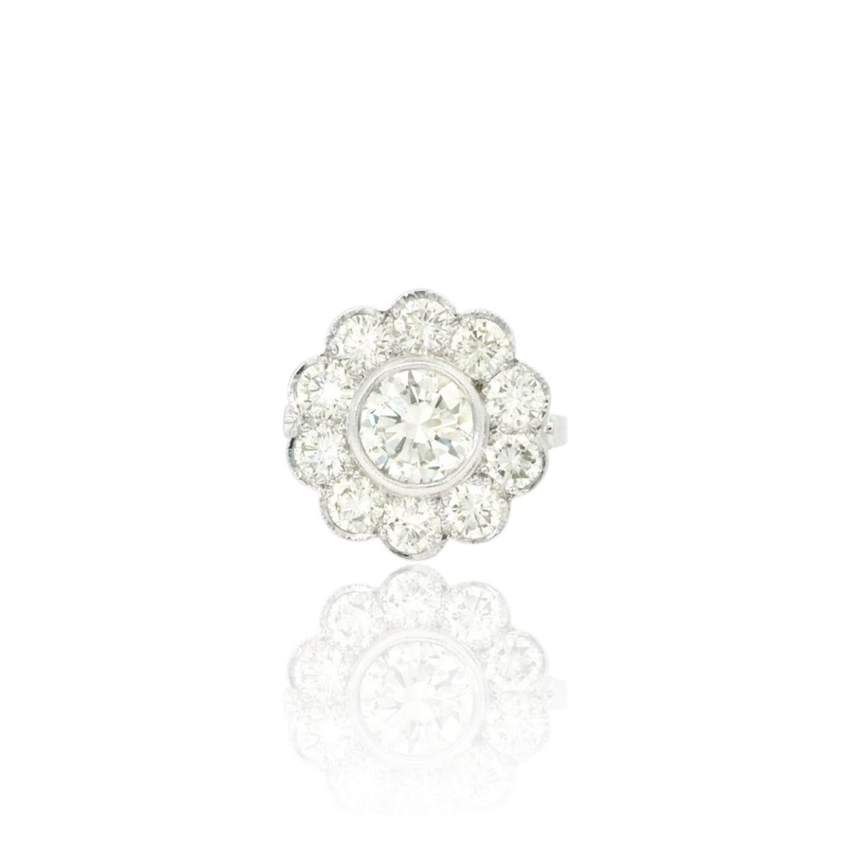 White gold 18K ring set with a center brilliant diamond of 1.65 Carats (estimated I/J color - Vs clarity) and 10 brilliant diamonds for a total of approximately 1.98 Carats (estimated I/J color - Vs/Si clarity).