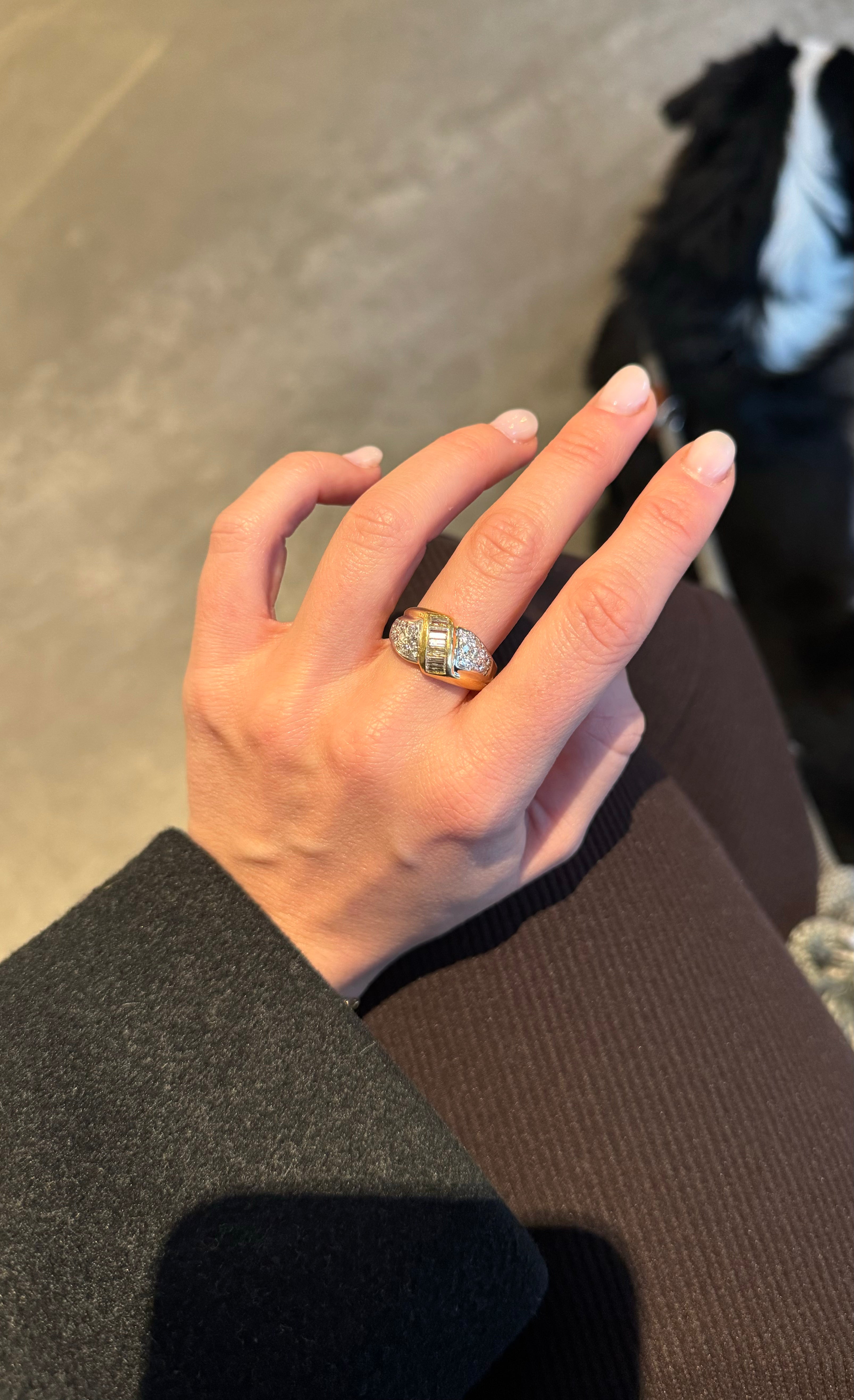 Bicolore yellow and white gold 18K ring set with 7 baguette shape diamonds for a total of approximately 0.40 Carats and 20 brilliant diamonds for a total of approximately 0.50 Carats.