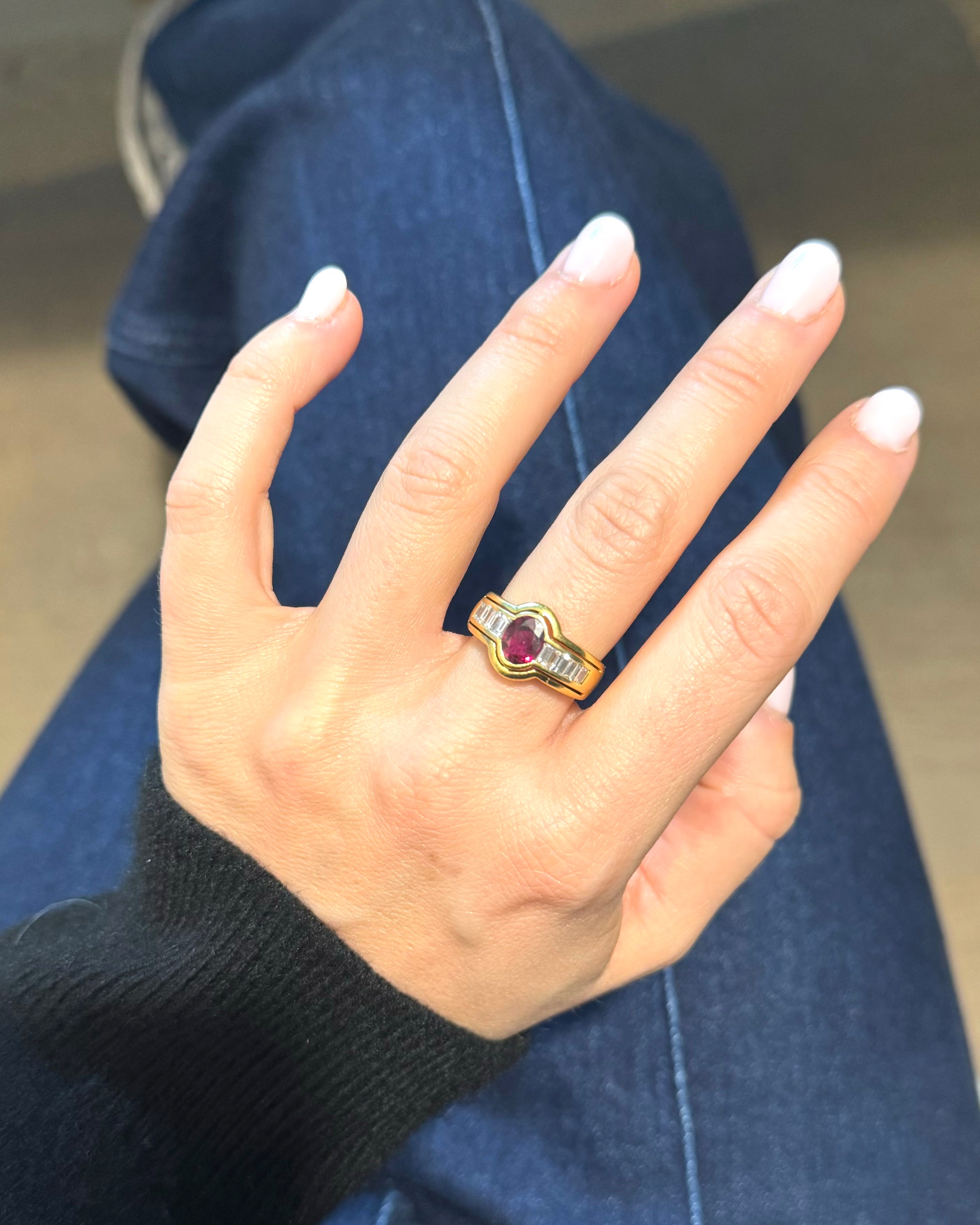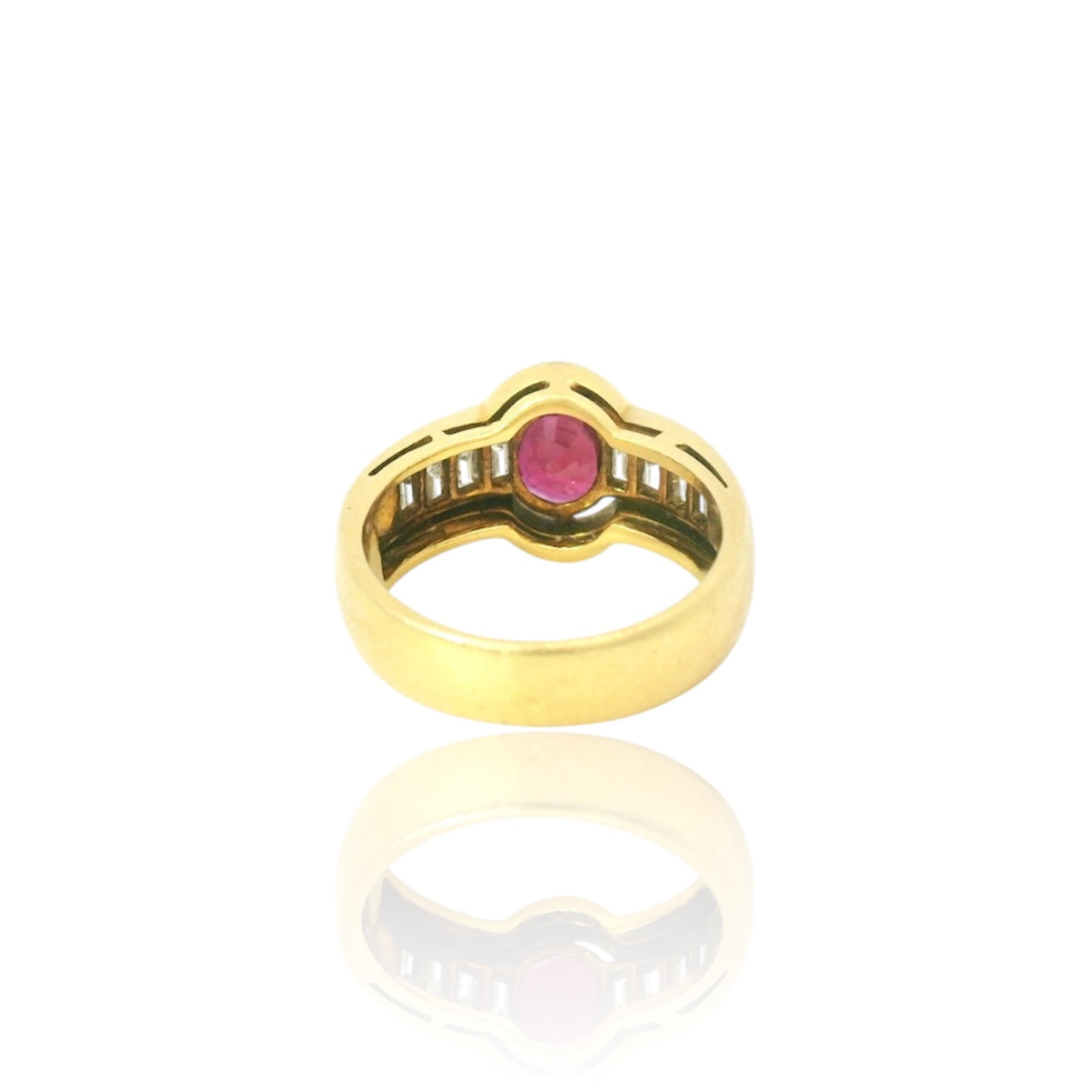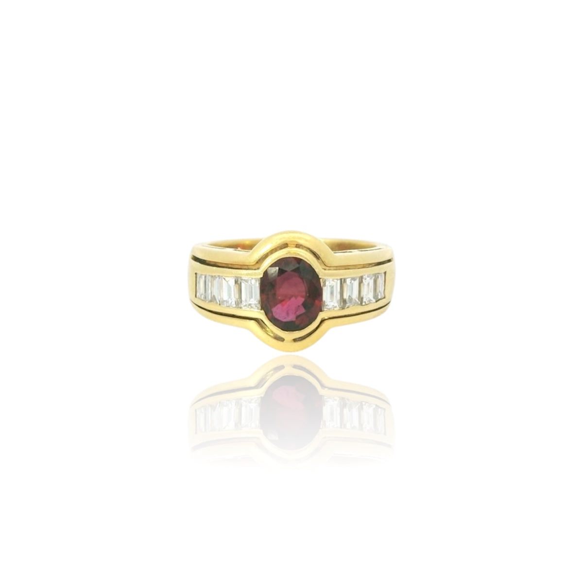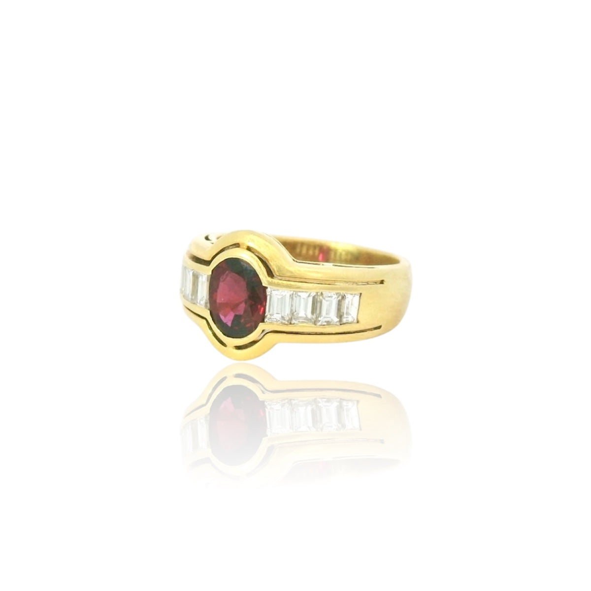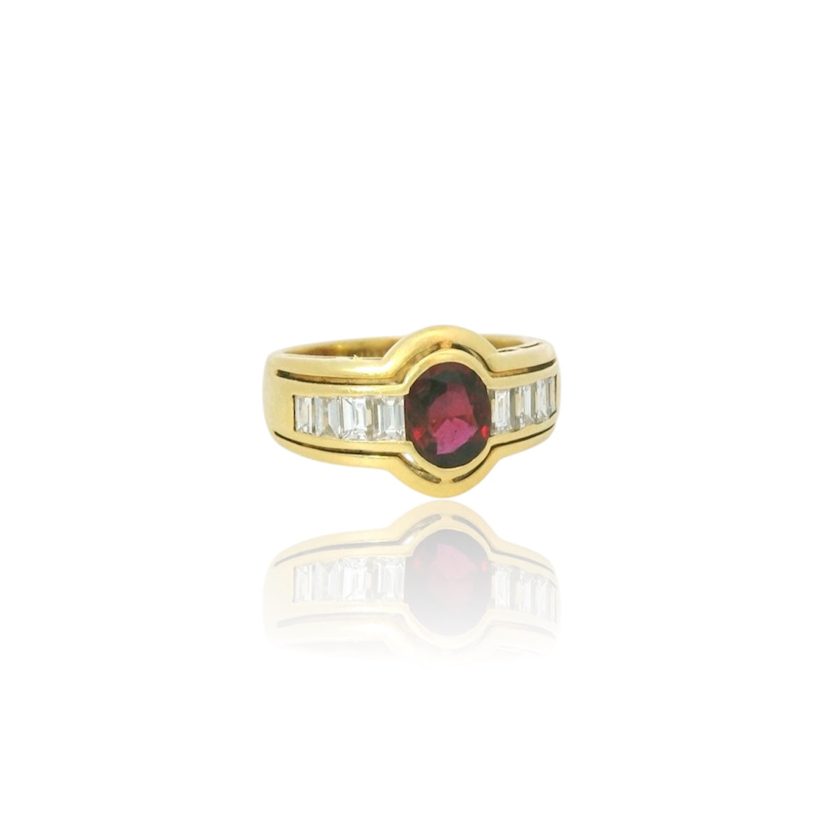 Vintage yellow gold 18K ring set with a center oval shape ruby of approximately 1.10 Carats and 8 baguette shape diamonds for a total of approximately 0.70 Carats (estimated F/G color - Vs clarity).