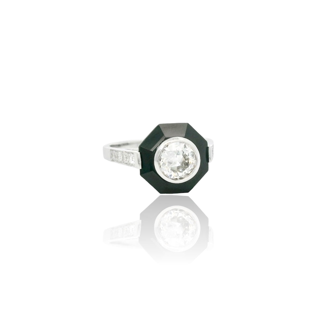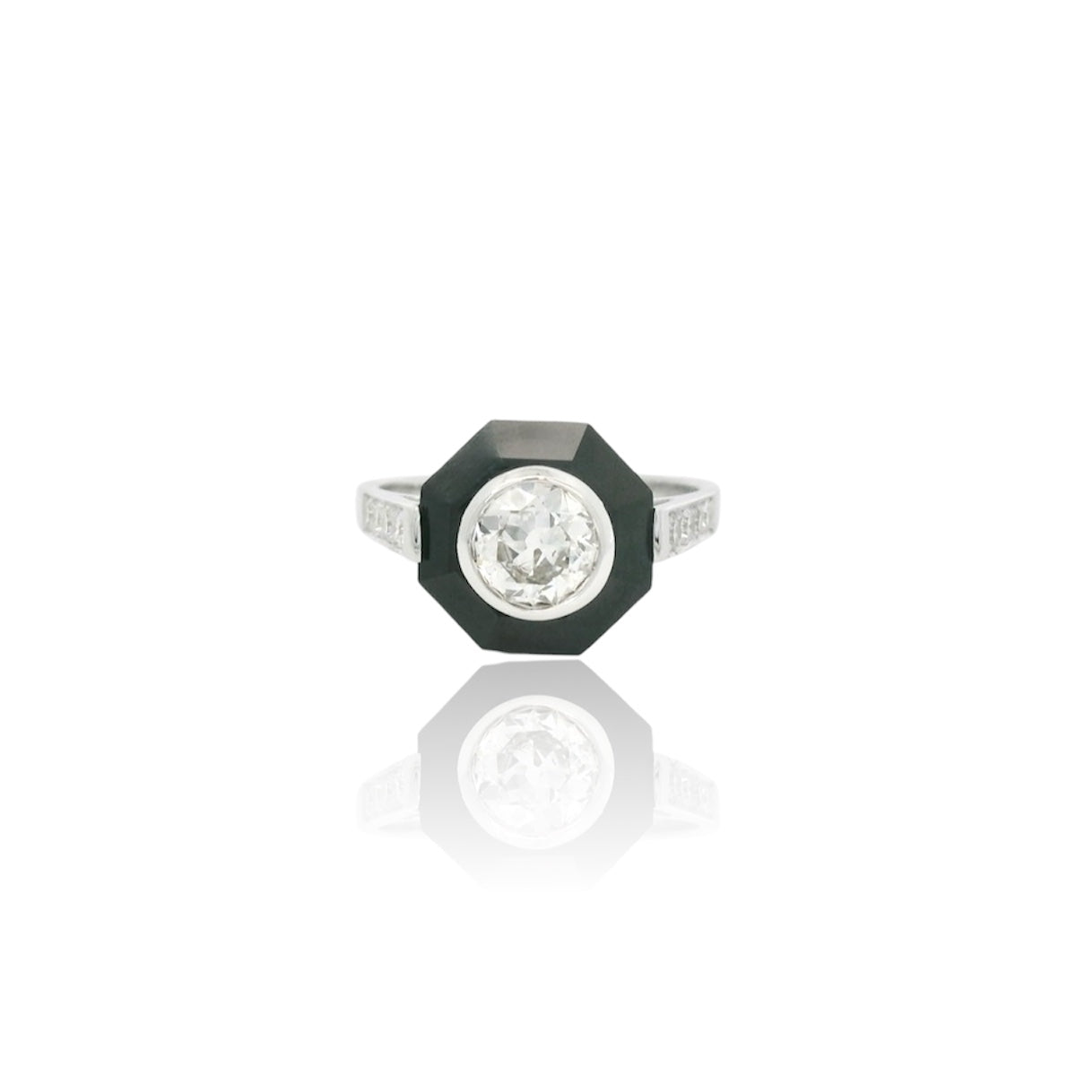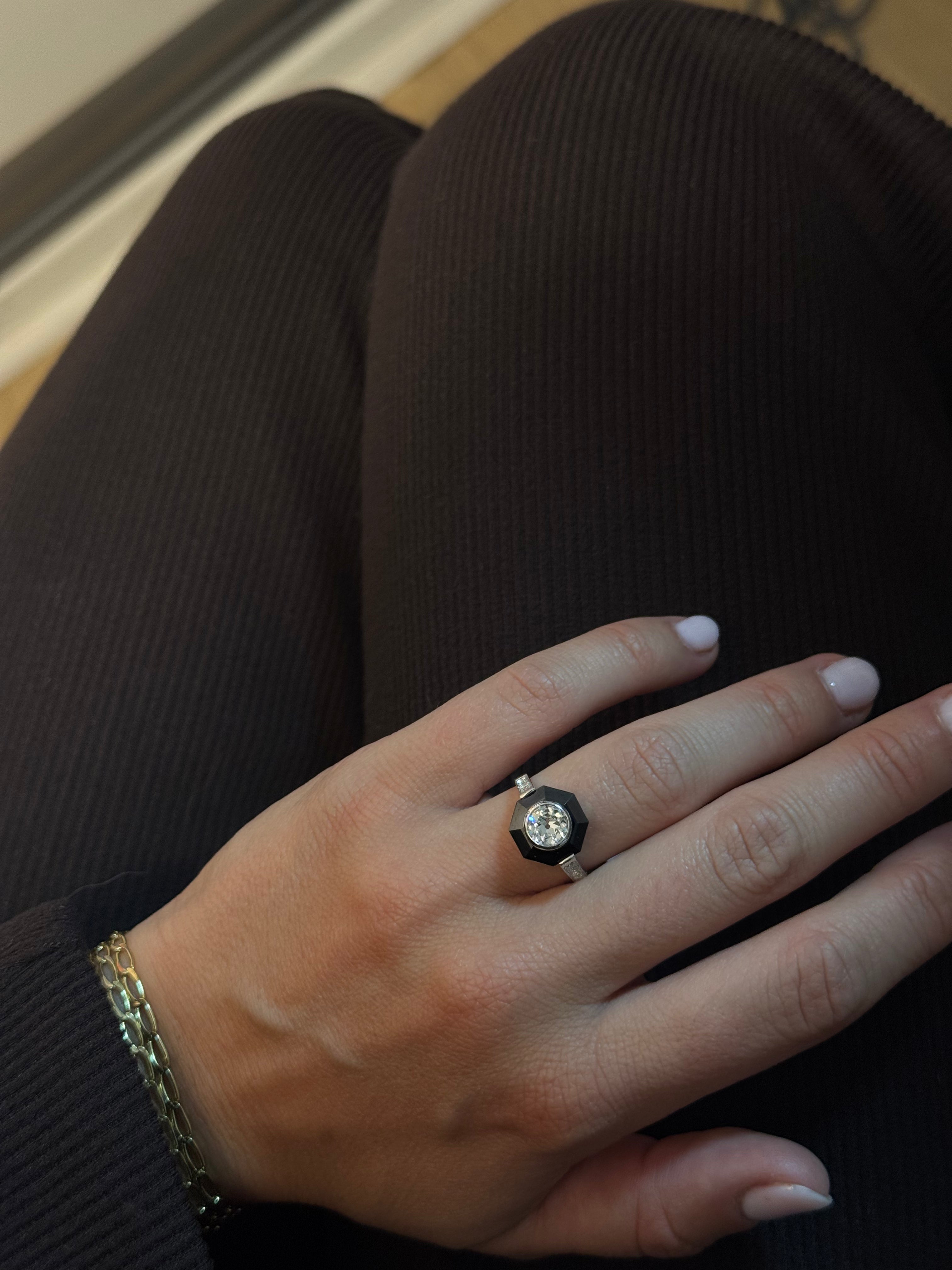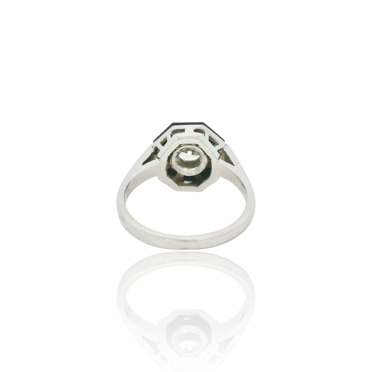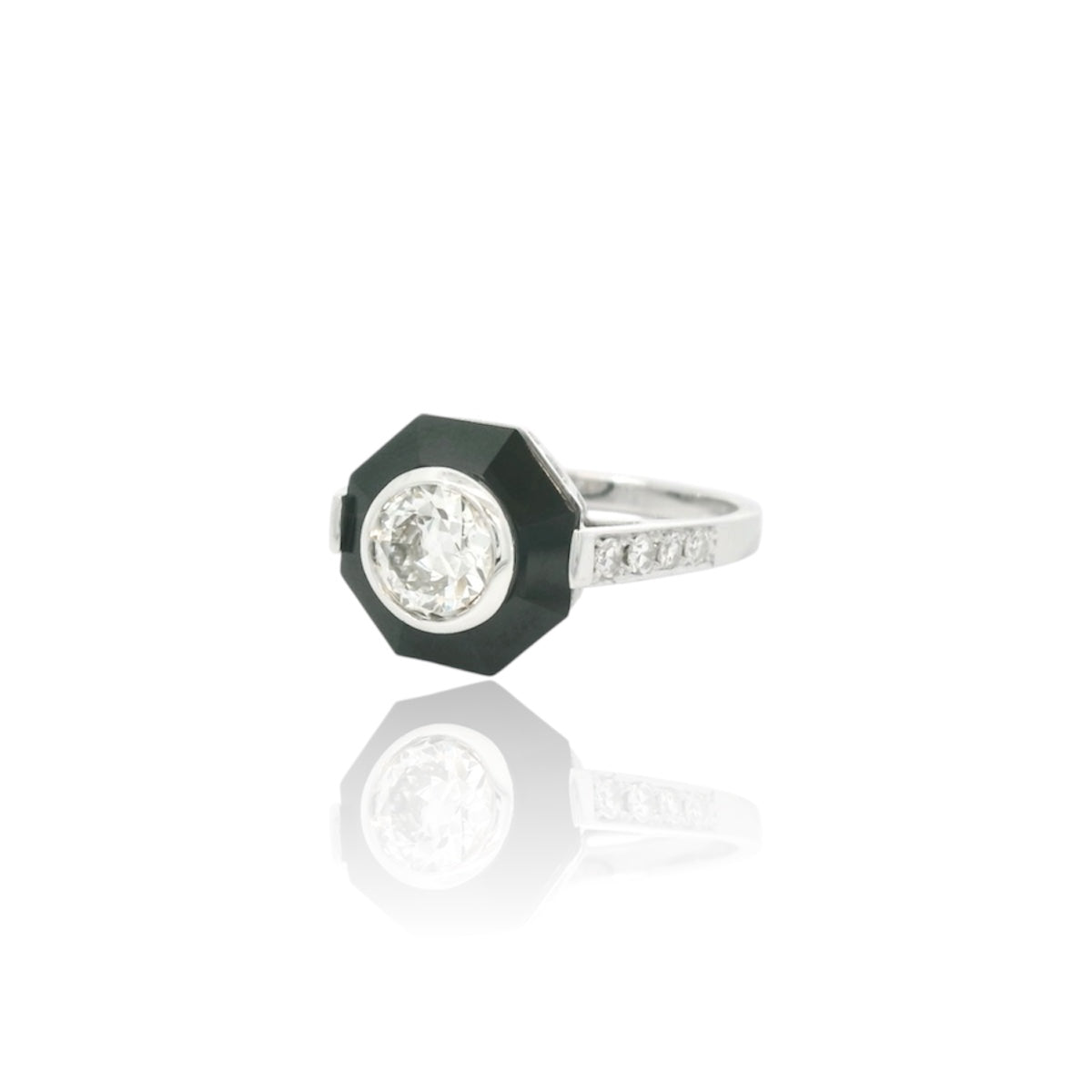 White gold 18K ring set with a center old European cut diamond of 0.80 Carats ( estimated H/I color - Si1 clarity), Onyx and 8 old cut diamonds for a total of approximately 0.20 Carats.
