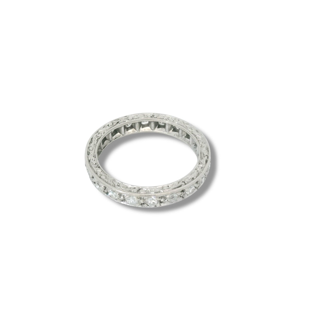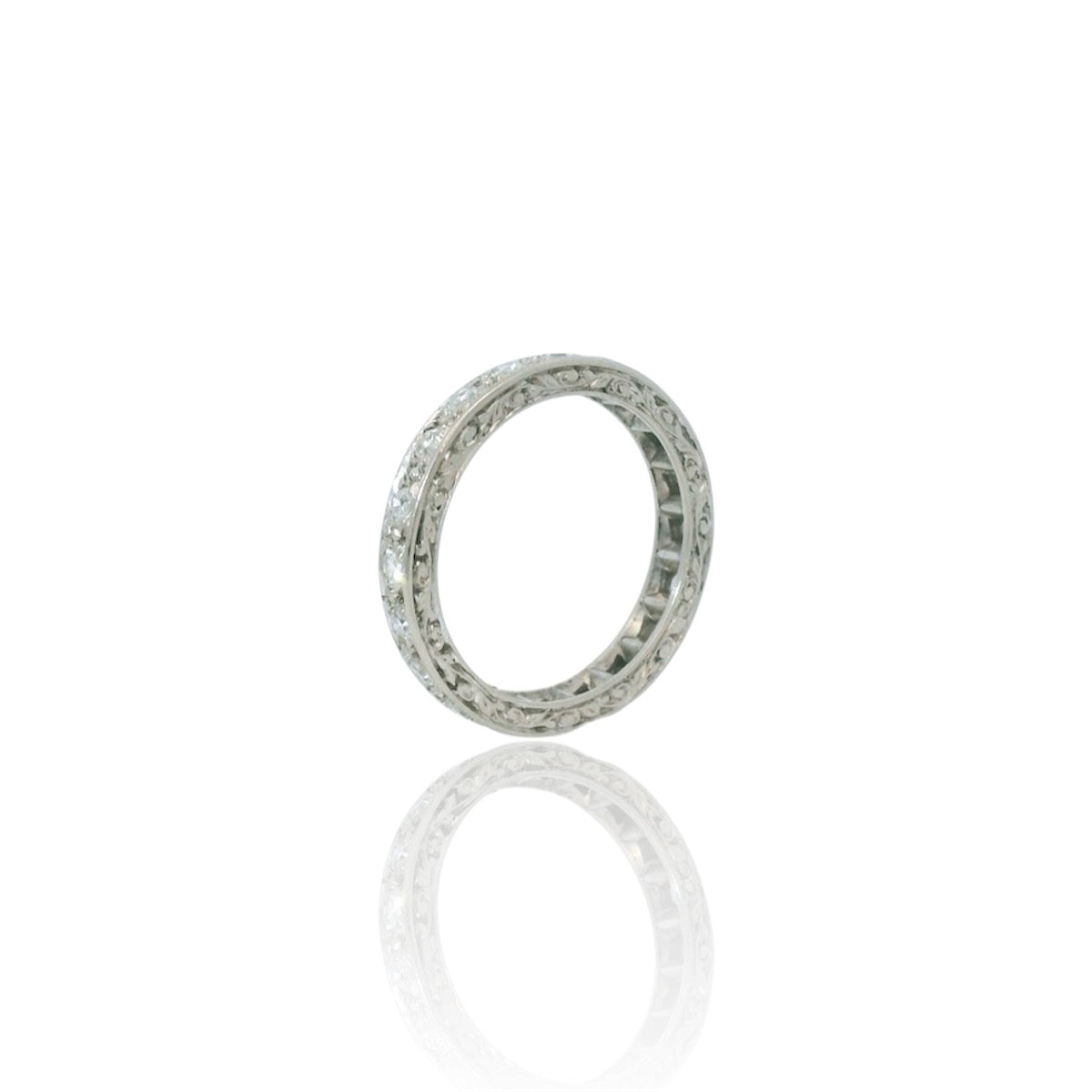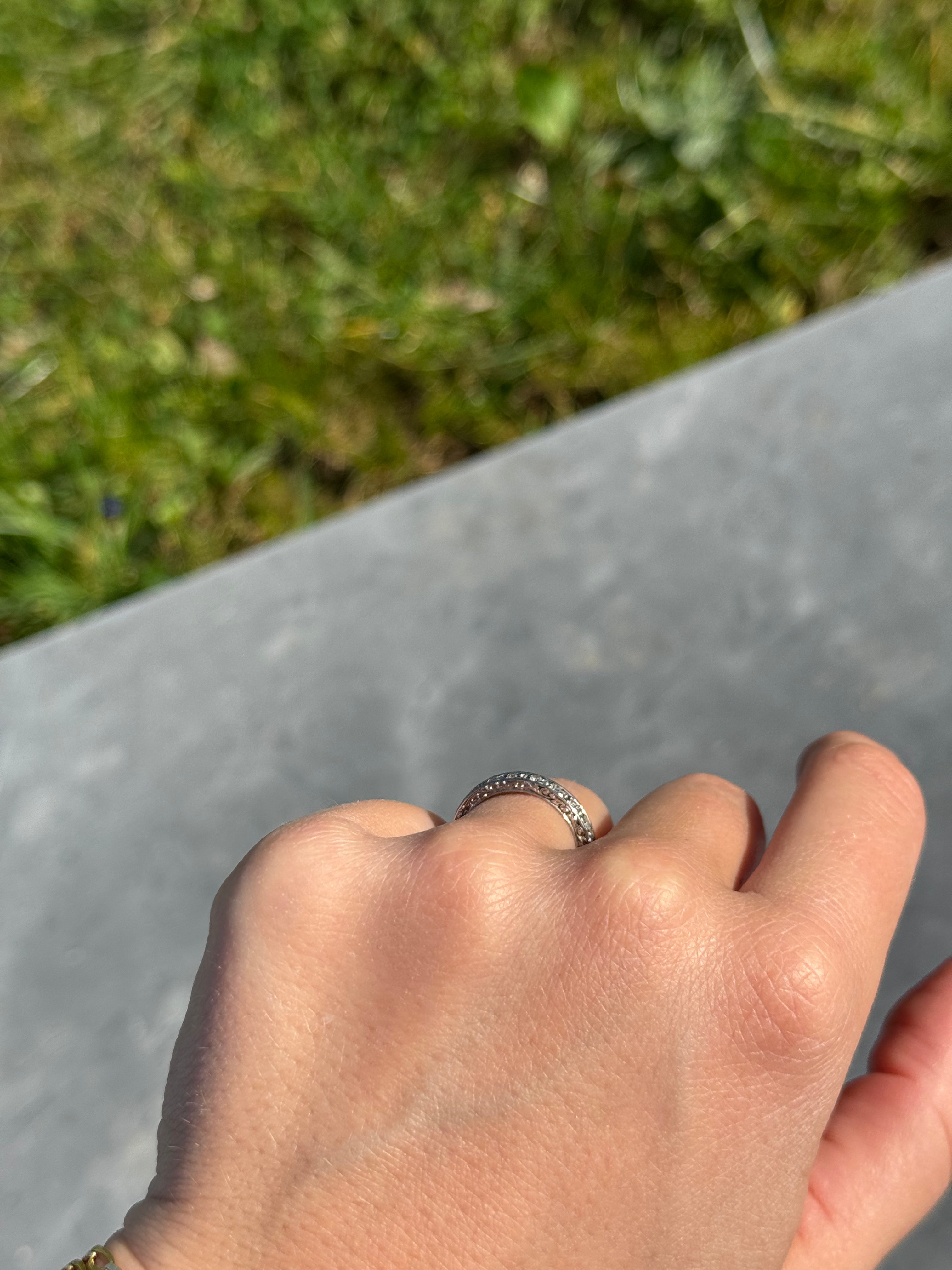The ring is set with 20 old cut diamonds for a total of approximately 0.50 Carats. The ring features beautiful hand-engraved details on each side of the band.