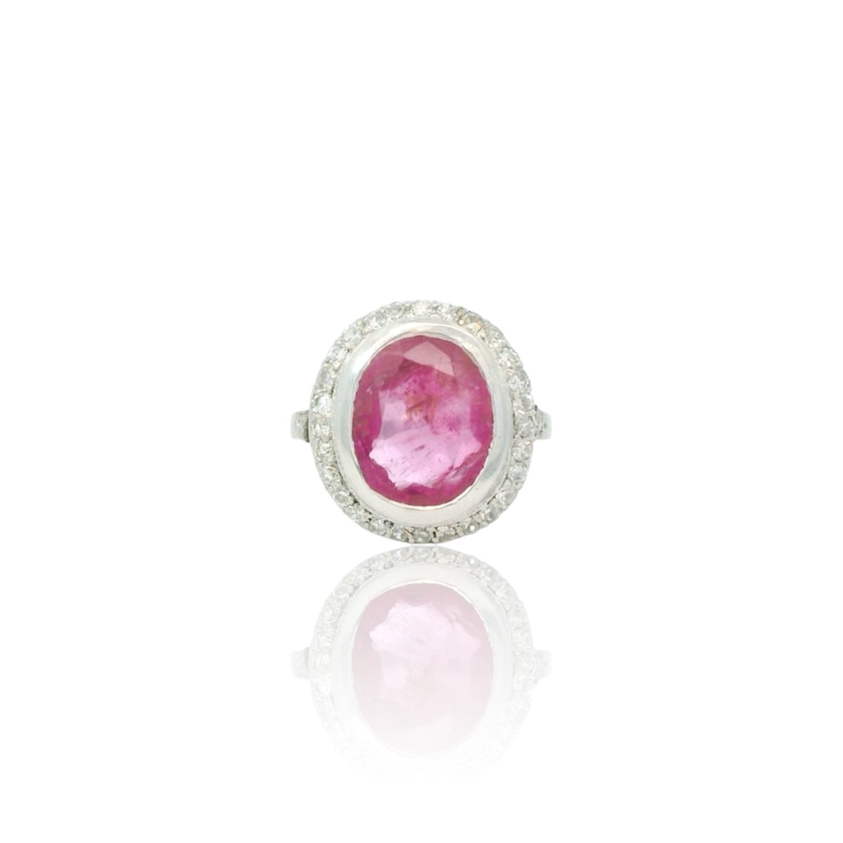 Vintage white gold 18K ring set with an oval natural no heated pinkish ruby of approximately 4.10 Carats and 35 old cut diamonds for a total of approximately 0.40 Carats.